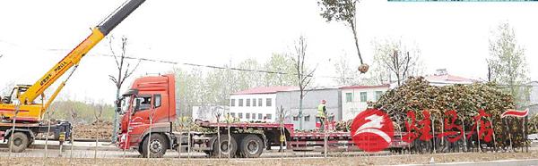 市白桥路南段,吊车正运送景观树。