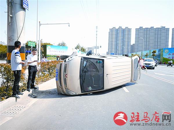 4月18日下午2时40分许,在市学院路与文新路交叉口,一辆五菱面包车撞到路边的高压线杆后翻倒在路边。