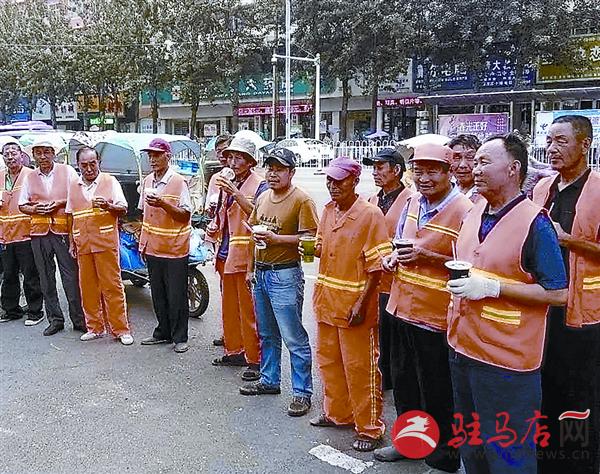 随后,记者联系了驿城区天美物业管理有限公司,该公司让部分环卫工到市乐山大道南段靖宇广场附近集合。记者将这一情况反馈给刘女士。半个小时后,记者和刘女士到达现场,刘女士将一杯杯奶茶分发给环卫工人(如图)。