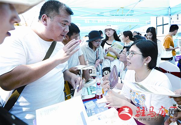 6月25日,在安徽省阜阳师范学院西湖校区高招咨询会上,家长在了解高校招生信息。