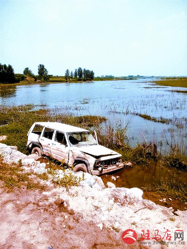 6月27日上午,记者来到驿城区板桥镇刘竹园村,看到村旁河中有一辆白色北京吉普车,车窗玻璃已全部破碎,车内积满了淤泥(如图)。