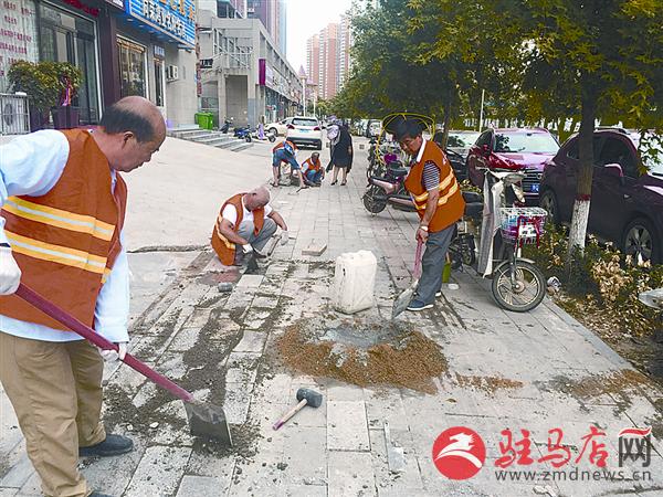 6月29日,在市金山巷,开发区城市管理局工作人员冒着高温,对破损人行道进行清理和修复。