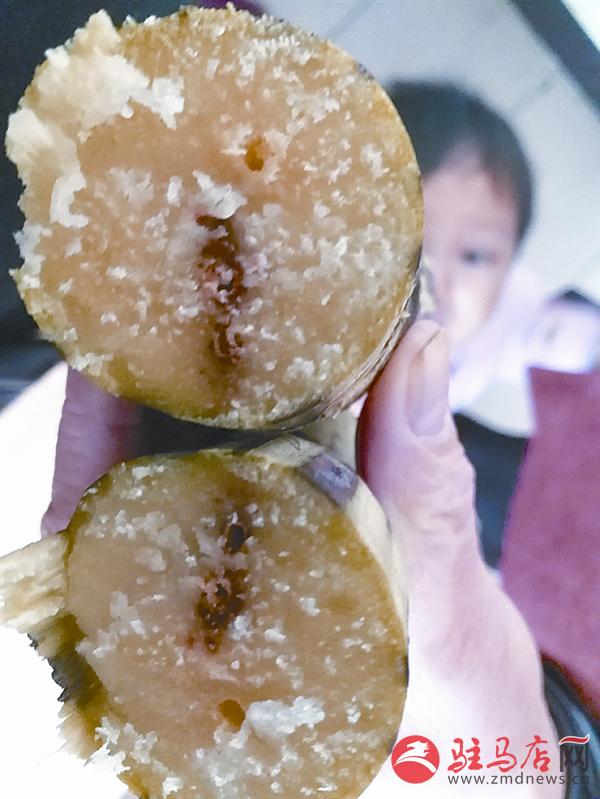 几个小时后,刘女士削了一根甘蔗准备一家人食用。让她没有想到的是,砍开后大家发现甘蔗中间是深红色的(如图)。刘女士和家人将其他几根甘蔗砍开,发现全部是“黑心”的。她跑到买甘蔗的地方,商贩早已不见踪影。
