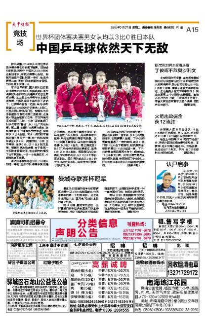 世界杯团体赛决赛男女队均以3比0胜日本队