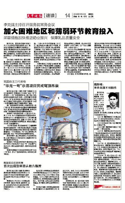 我国自主三代核电“华龙一号”示范项目完成穹顶吊装