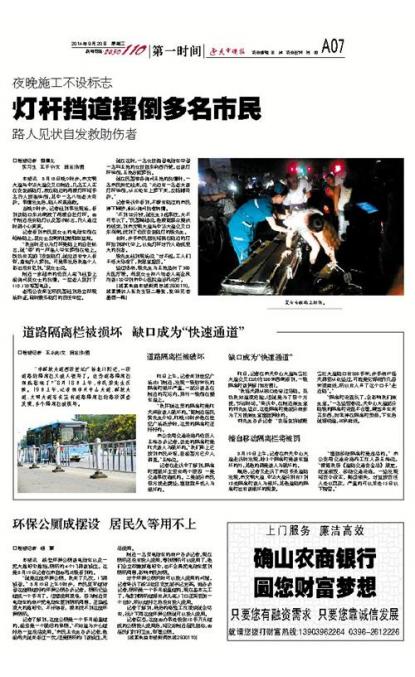 夜晚施工不设标志灯杆挡道撂倒多名市民